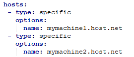Define the name of the host in the options: name property, by copying it from the on-prem hosts table. Add additional hosts by repeating the type: specific parameters.