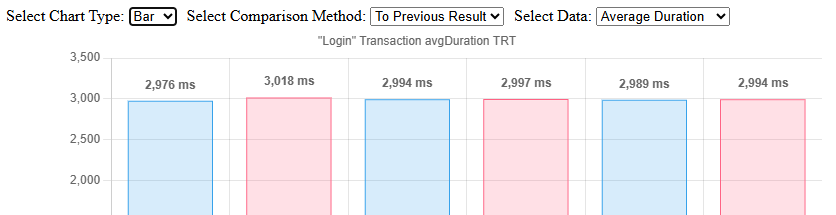 The report graphs can be generated in bar or line format, and you can compare each run to the previous one, or compare the most recent run to the oldest saved data. You can also opt for a dynamic format, enabling you to change the parameters directly within the report, so that the graphs are automatically updated. All definitions for the graph generation are in the common_config.yml file. For details, see Configure report settings.
