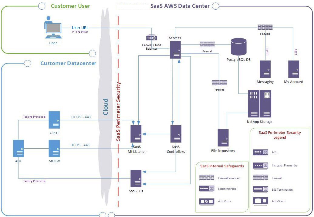This diagram illustrates the SaaS environment and interaction between the OpenText Enterprise Performance Engineering and customer AUT environments.