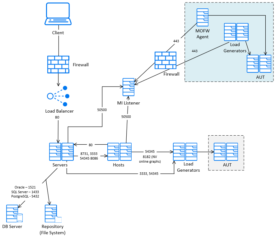 When testing applications that are located behind a firewall relative to the server or host machine, you must configure an MI Listener, a load generator over a firewall, and possibly a monitor over a firewall.