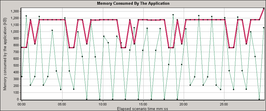 In the following example, the memory consumption peaked to 1337 KBs at 30 minutes into the test, for one of the transactions.