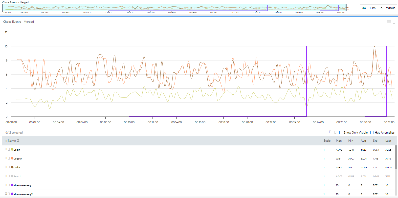 After the performance test run, view the graph in the offline results or in Analysis. The Chaos Events graph is automatically displayed, showing data for the disruption events.