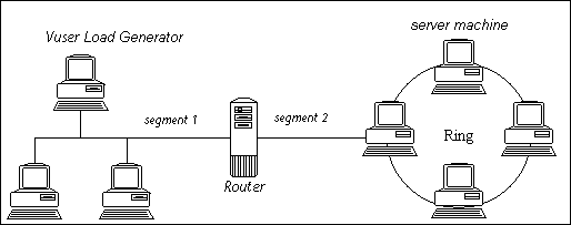 The following diagram shows a typical network. To go from the server machine to the Vuser machine, data must travel over several segments.