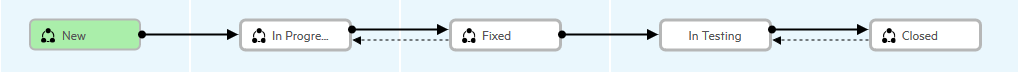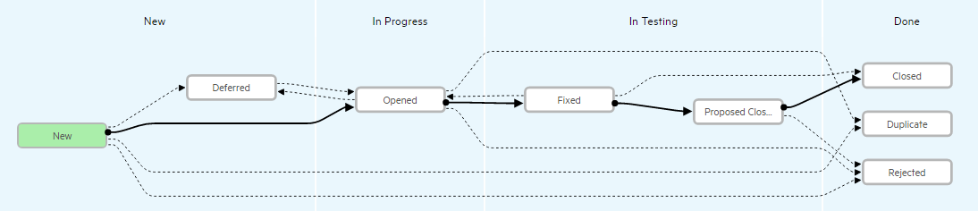 Transitions that are alternate workflow paths. These transitions are not essential to the primary logic of the workflow. Under certain circumstances, an entity will follow the alternate path. Indicated by a dotted arrow: Example: Most New defects follow the primary path to the Opened phase. However, a New defect may be Deferred if there are not enough resources to handle it. |