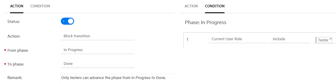Rules with the Block Transition action prevent users from transitioning from one phase to a specific phase, even though the transition is generally permitted in the workflow for the entity.