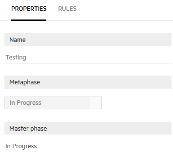 If you select a phase in a shared workflow from within a workspace, the master phase field displays the original phase in the shared workflow on which changes were based. You can see the master phase field in the PROPERTIES pane on the right.