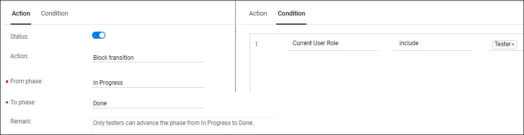 Rules with the Block Transition action prevent users from transitioning from one phase to a specific phase, even though the transition is generally permitted in the workflow for the entity.
