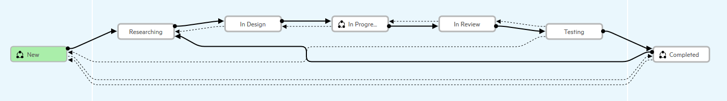 A workflow is a representation of the phases through which an entity advances as it is being developed. Workflows are available for any entity which proceeds through development, such as requirements, defects, and tests.