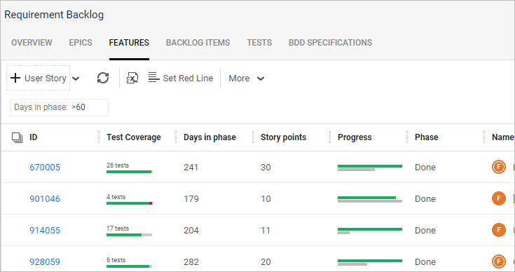 By default, test coverage is comprised of all last runs for all tests linked to the work item. If the same test covers two features, all of its runs affect the status of both features.