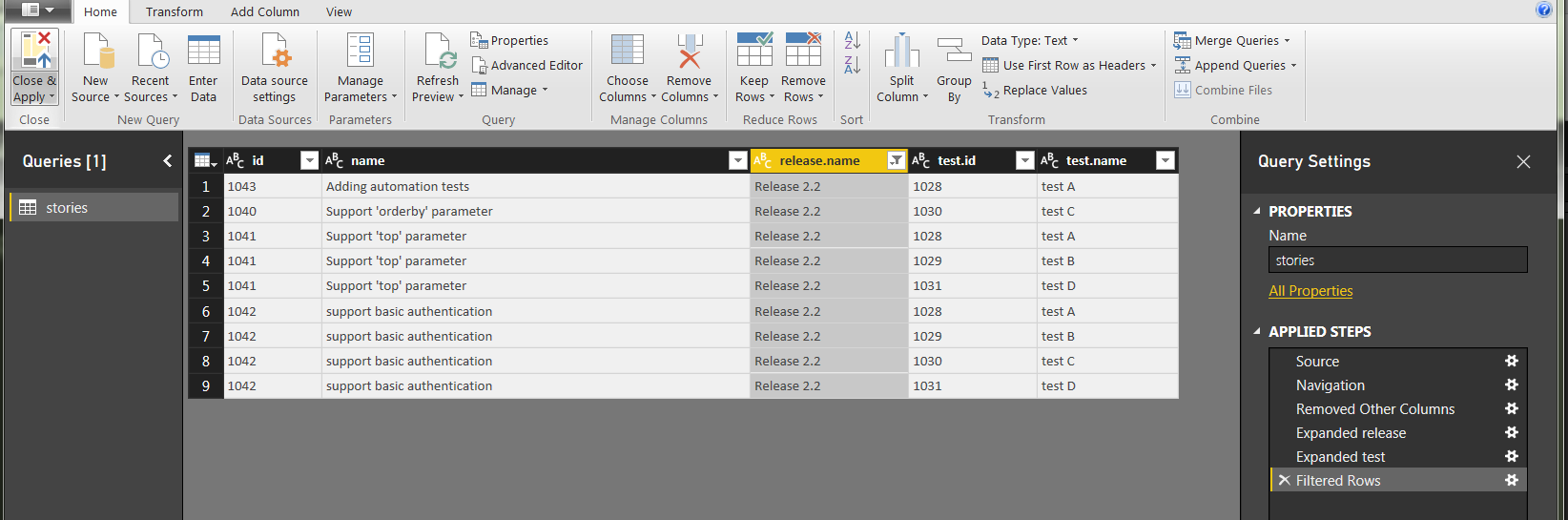 For example, select the ID, name, release, and tests columns.