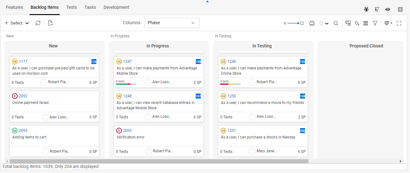 The Features and Backlog > Backlog Items board views allow you to arrange the columns by other fields besides Phase. For example, if you select the Milestone field, the columns will be arranged by milestones, not phases.