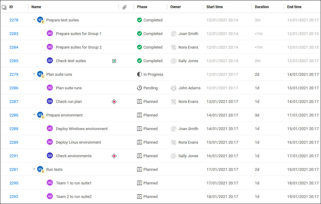 Example: Running a regression cycle involves a series of stages: Prepare test suites, plan suite runs, prepare and configure an environment for testing, run tests, analyze the results.