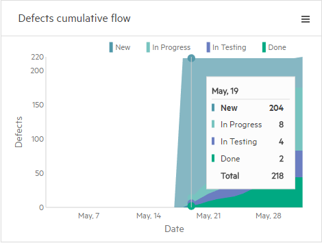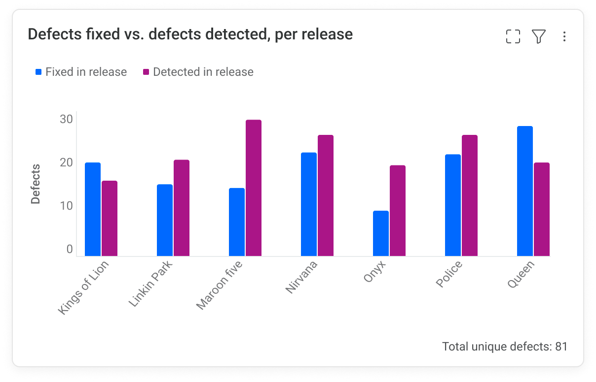 The following example shows two metrics with a single data set. One metric shows the number of defects fixed in the release, while the other shows the total number of defects detected in the release.