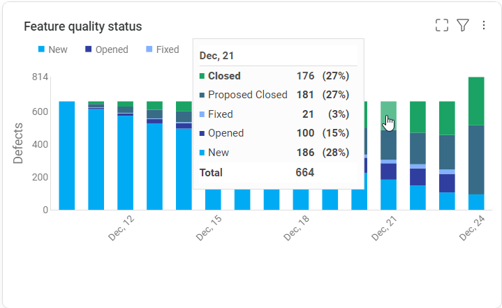 In trend-based graphs, you can drill down to items from a specific time period and compare data from different periods. For example, this can help you understand scope changes over the course of a release: you can compare the number of planned features at the beginning and the end of a release, and view which planned features were added, removed, or unchanged during that period.