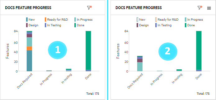 Example: Widget 1 displays all of the data. In widget 2, New and Ready for R&D are hidden, to hide features that are not yet ready to be documented. The values are deselected in the legend, and the related data is not shown in the graph.
