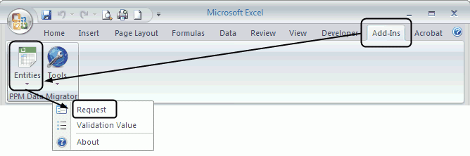 On the Add-Ins tab, select Entities > Request from the PPM Data Migrator group.