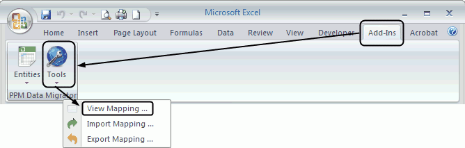 On the Add-Ins tab, select Tools > View Mapping from the PPM Data Migrator group.