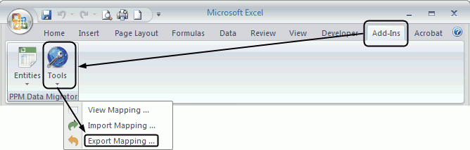 On the Add-Ins tab, select Tools > Export Mapping from the PPM Data Migrator group.