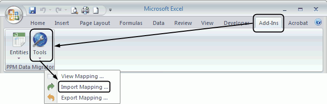 On the Add-Ins tab, select Tools > Import Mapping from the PPM Data Migrator group.
