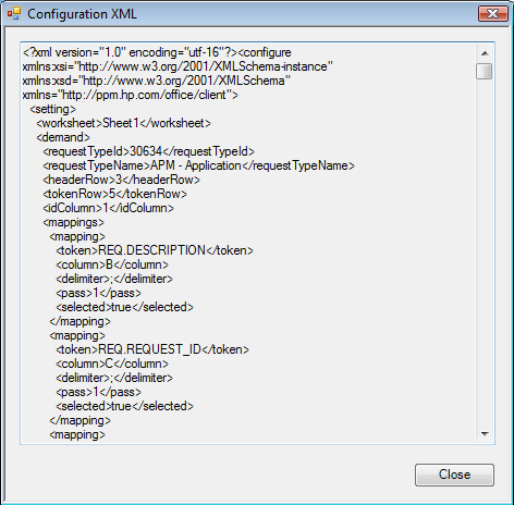 You can view the column-to-field or attribute mapping relationships configured for spreadsheets that you downloaded using Data Migrator and spreadsheets you used to create or update entity data or update validation values. The mapping relationships are displayed in XML format.