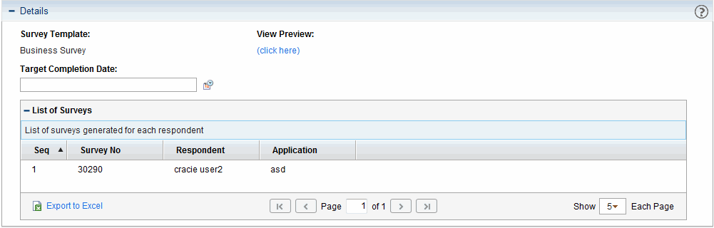 Read-only. A table containing the list of surveys that were sent. Includes the survey number, and name of the application, and the respondent for each survey sent. This table is named List of Applications & Respondents before the survey registration is submitted. |