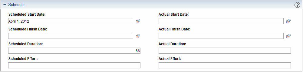 In the Schedule section, enter the planned and actual start dates, finish dates, duration, and effort.