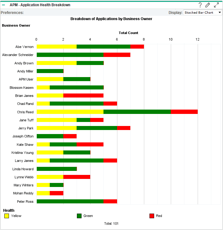 The Application Health Breakdown portlet displays the number of applications by health for each business owner. This portlet can be displayed as a stacked bar chart (default), clustered bar chart, or list. Use this portlet to track how many applications are owned by each business owner and the health of each application.