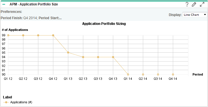The Application Portfolio Size portlet displays the number of applications in the portfolio over a period of time. This portlet can be displayed as a line chart (default), XY chart, radar chart, or list. Use this portlet to track how many applications were in the portfolio over a specified period of time.