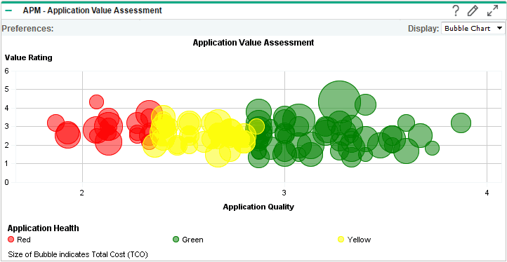 The Application Value Assessment portlet displays an application's quality, health, value rating, and total cost of ownership. This portlet can be displayed as a bubble chart (default) or list. Use the information in this portlet to determine how or if an application needs to be assessed. For example, an application that scores low on quality but high on value rating might need to be assessed for improvement opportunities.