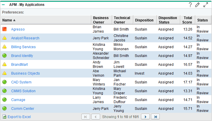 The List of Applications (Analyst) portlet displays a list of all applications in your organization's portfolio. By default, this portlet displays an application's name, business owner, technical owner, disposition, disposition status, total score, and status. Use this portlet to view basic information about an application. Create a customized version of the portlet to track and assess data meaningful to you.