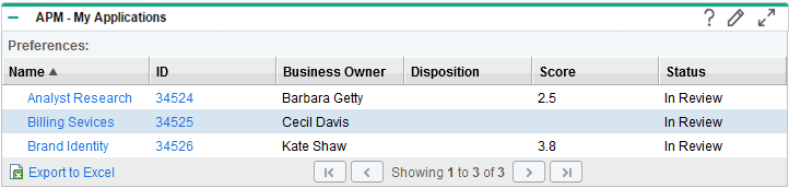 The My Applications portlet displays a list of applications that you created or own. You can create a customized version of the portlet to track and assess data meaningful to you.
