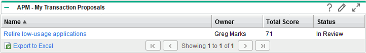 The My Transformation Proposals portlet displays all active and approved transformation proposals that you created or own. Use this portlet to view transformation proposals that can be developed as projects.
