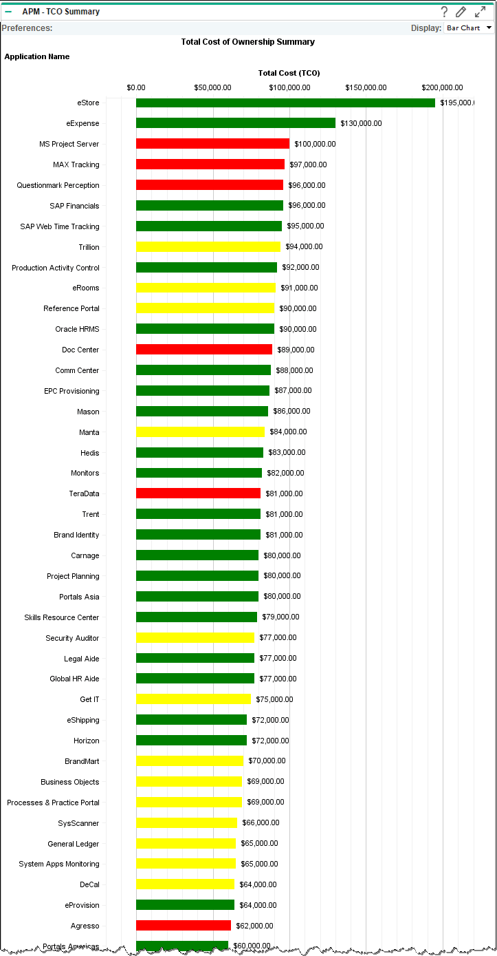 The TCO Summary portlet displays the total cost of ownership by application. This portlet can be displayed as a bar chart (default), pie chart, or list. Use this portlet to determine the total cost to own and operate an application.