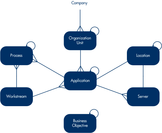 Figure 3-1. Entity relationships shows the relationships that can exist between entities in an APM user's application portfolio.