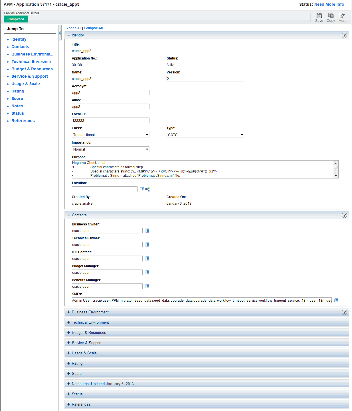 For detailed descriptions of the sections and fields unique to the detail page for an application entity, see Application Entities. If your organization's implementation of APM provides you with access to additional entities (such as workstreams or processes) or fields, see the Application Portfolio Management Analyst's Guide for descriptions.