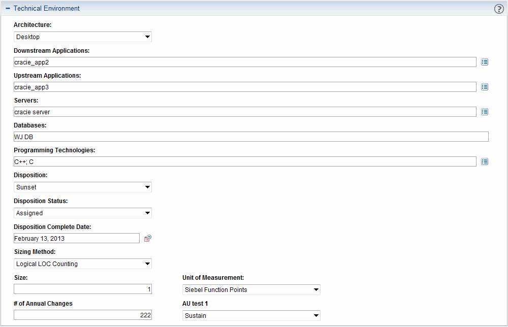 In the Technical Environment section, enter the technologies used in the construction of the application, connectivity to other systems, and planned disposition.