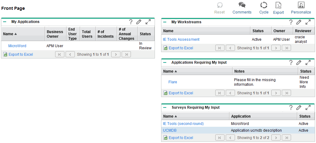 The Front Page PPM Dashboard page for APM users displays portlets that provide information you might want to track regularly. These portlets provide information about the applications you own, workstreams for which you are a resource, applications requiring your input, and surveys requiring your response.