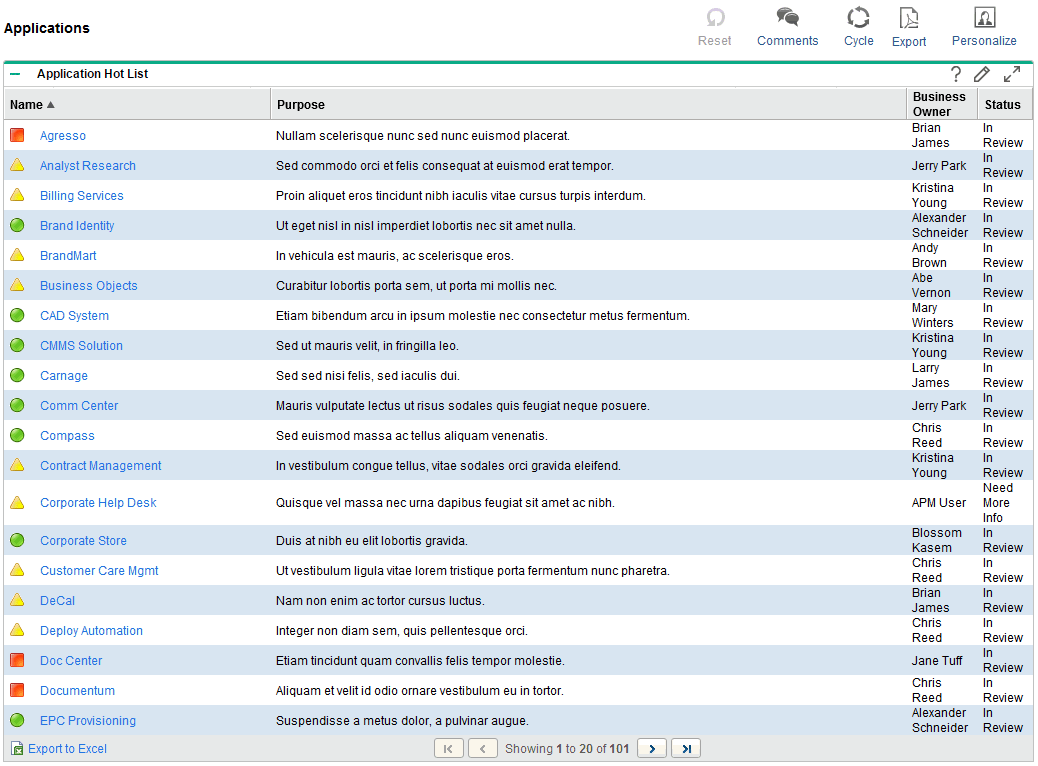This portlet displays a list of all the applications in your organization's portfolio. Use this portlet to track basic information about the applications. The following columns are displayed: Name, Purpose, Business Owner, and Status. By default, applications are listed alphabetically by name. |