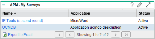 By default, this portlet displays the survey name, application name, and status. Survey requests are listed alphabetically by name.