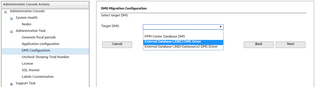 Available DMS Migration options for a PPM server currently using PPM Center Database DMS