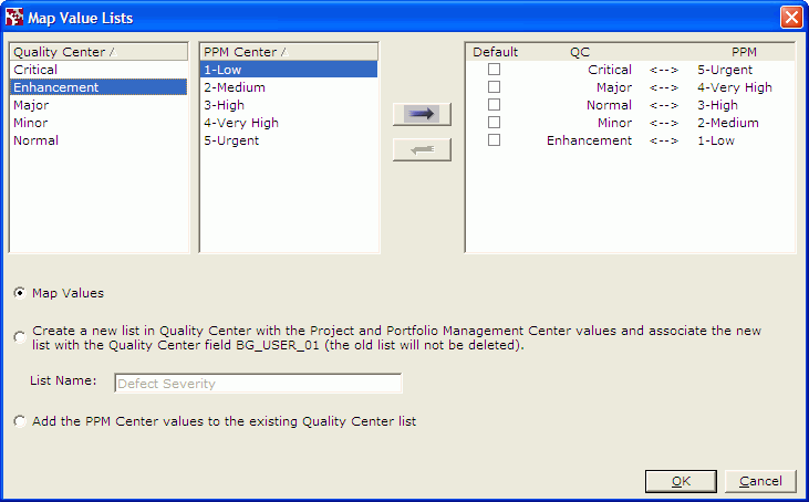 The pair of mapped values appears in the right pane of the Map Value Lists window. For example, if the value representing lowest impact in the Quality Center field is Enhancement and the value representing lowest impact in the OpenText PPM field is 1-Low, map the two values as shown in the following figure.
