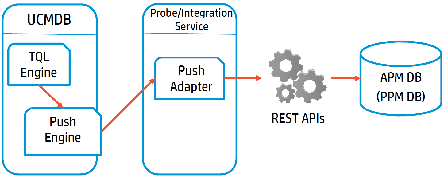 The Push Adapter is a generic framework for easily configuring push adapters, using only XML and Groovy. It allows easy mapping of the data from the UCMDB data model into the APM data model, and the transfer of this converted data into the APM database through REST APIs called from APM.