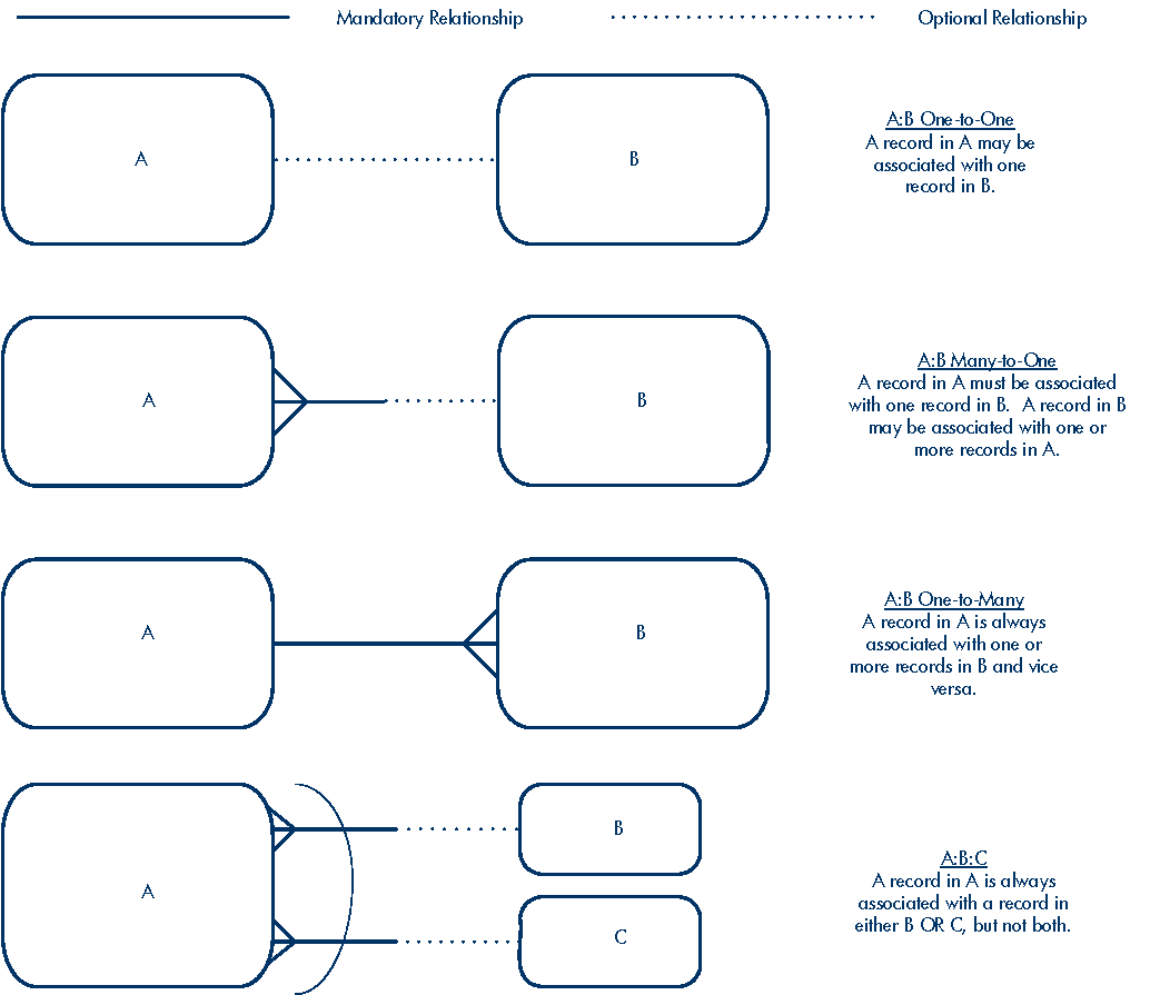The following figure illustrates the conventions used to characterize relationships in the following entity relationship diagrams (ERDs).