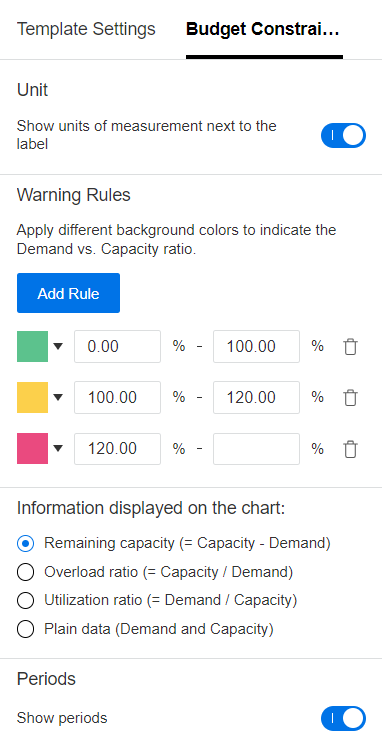 Assign colors to present various Demand vs. Capacity ratios and configure the chart to display such information as remaining capacity or overload ratio. For details, see Configure widgets.