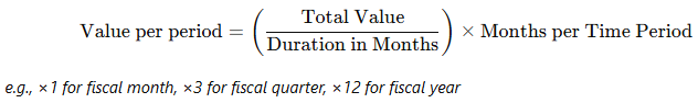 • Value per Fiscal Month: Distributes the total value evenly across all months in the duration and then multiplies it by the number of months in each time period.