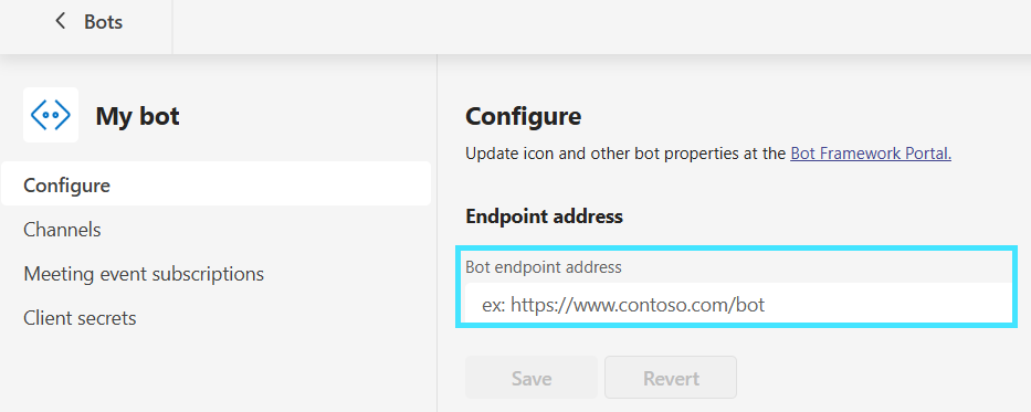 On the bot's Configure page, set the Endpoint address based on the NLP tool: