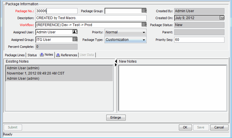 In the Package window, the Notes tab (Figure 3-1. Package window, Notes section ) displays additional package information. Notes are attached to the package, and not to individual package lines. If you have a note that is specific to a package line, you must include the package line reference as part of the note text.