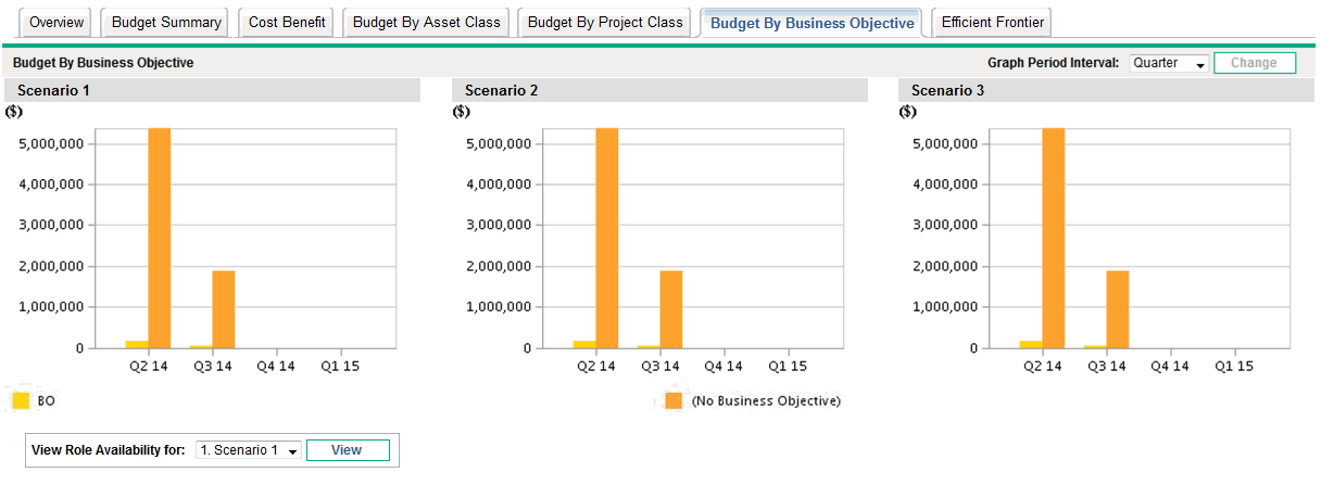 The graph for each scenario consists of a bar chart with adjacent bars (one for each business objective) in each period. The bars allow you, for each scenario, to compare the budget distribution among the various business objectives.