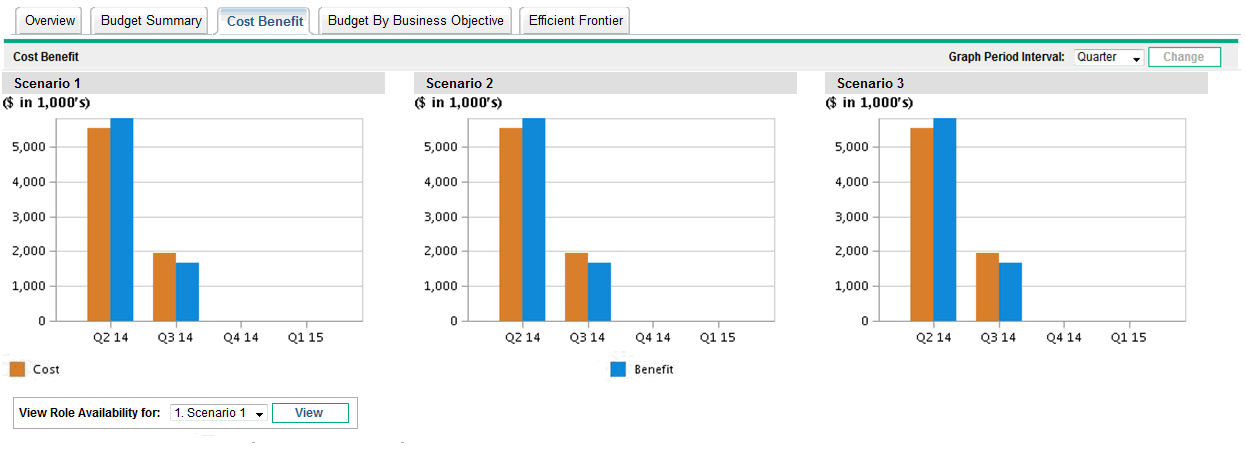 The Cost Benefit tab in the Scenario Comparison page provides a graph illustrating the cost/benefit analysis for each scenario. See Figure 5-5. Scenario Comparison page, Cost Benefit tab.