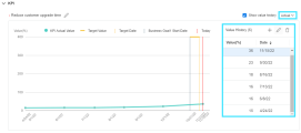 The performance of the business goal during the past periods, based on the KPI values. The chart displays all the actual KPI values entered for the past periods. If there are more than seven KPI values, only the last seven values are displayed. |